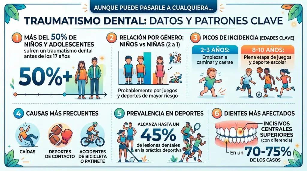 Puede pasarle a cualquiera, pero los datos muestran un patrón claro. Más del 50 % de los niños y adolescentes sufren un traumatismo dental antes de los 17 años. La proporción entre niños y niñas es de 2 a 1, probablemente por el tipo de juegos y deportes de mayor riesgo.